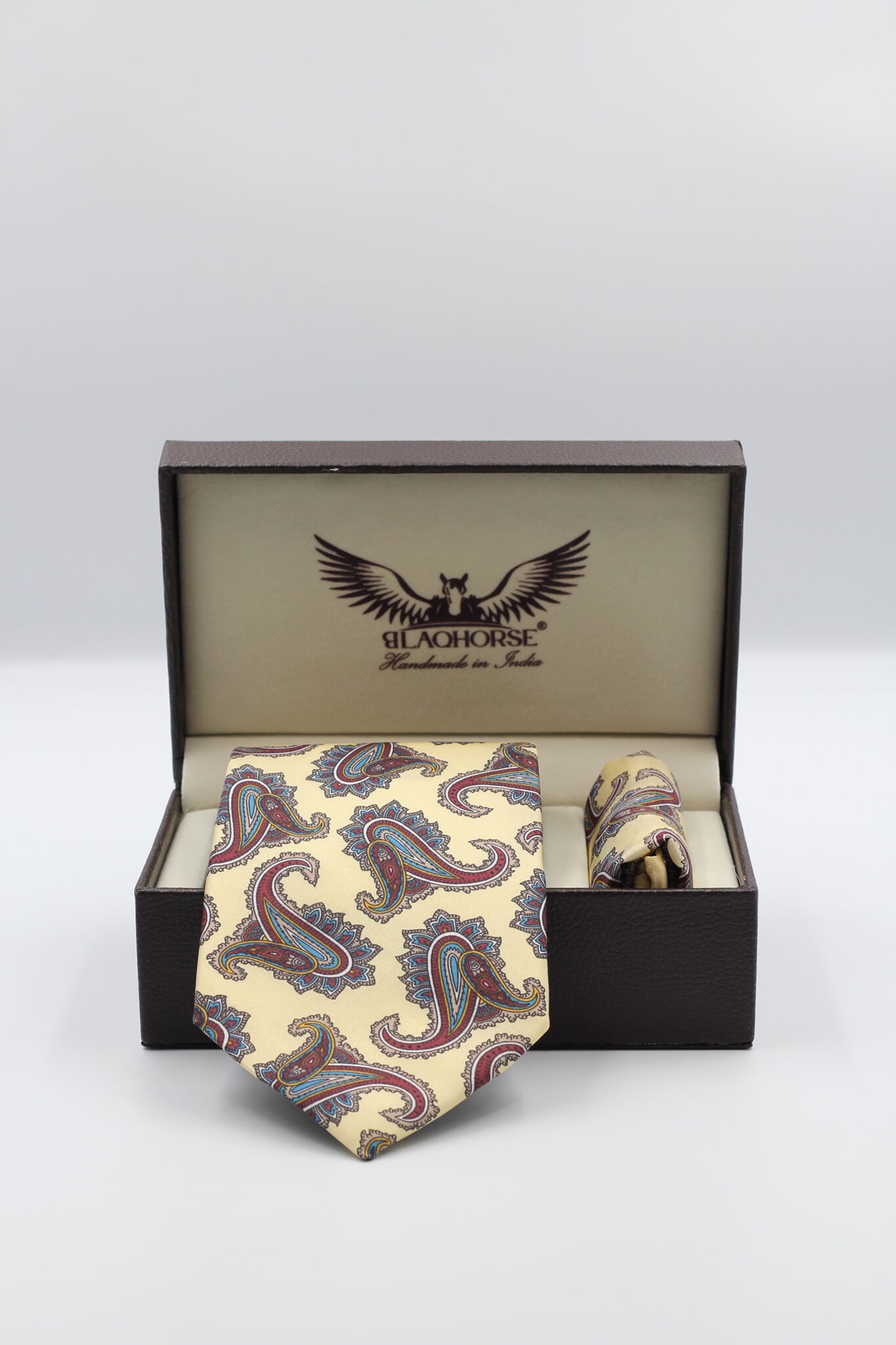 Elevate your formal attire with our Beige on Maroon Paisley satin silk tie and matching pocket square. Crafted in India from premium satin silk, this tie is expertly made using traditional hand-sewing techniques for exceptional quality.