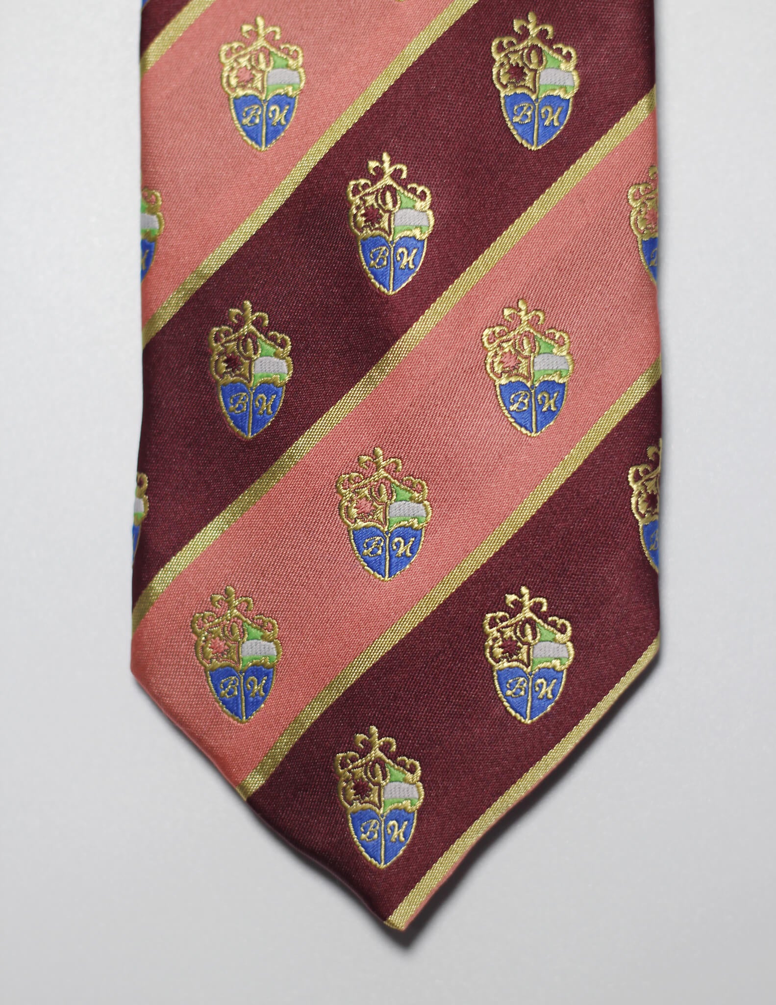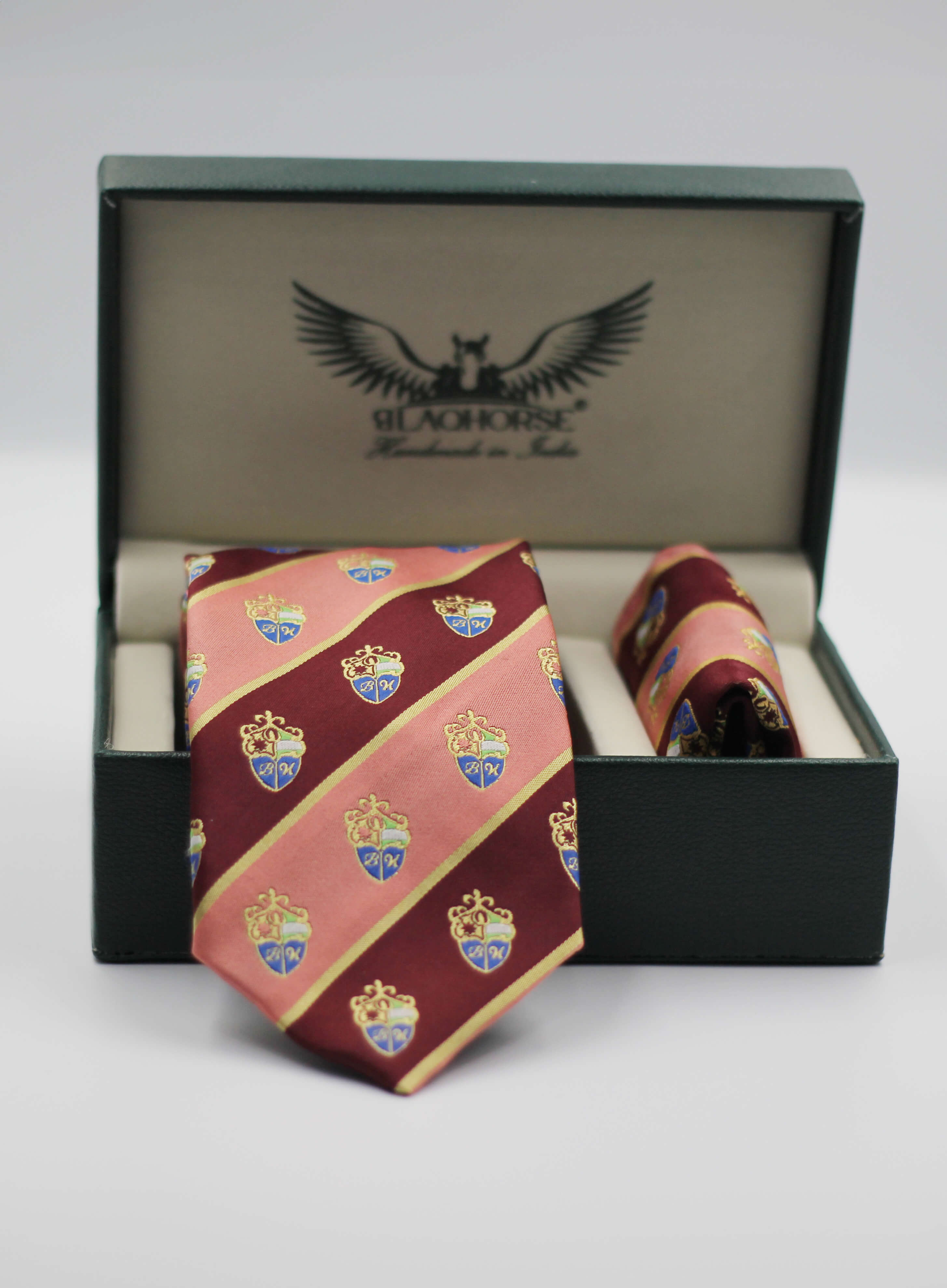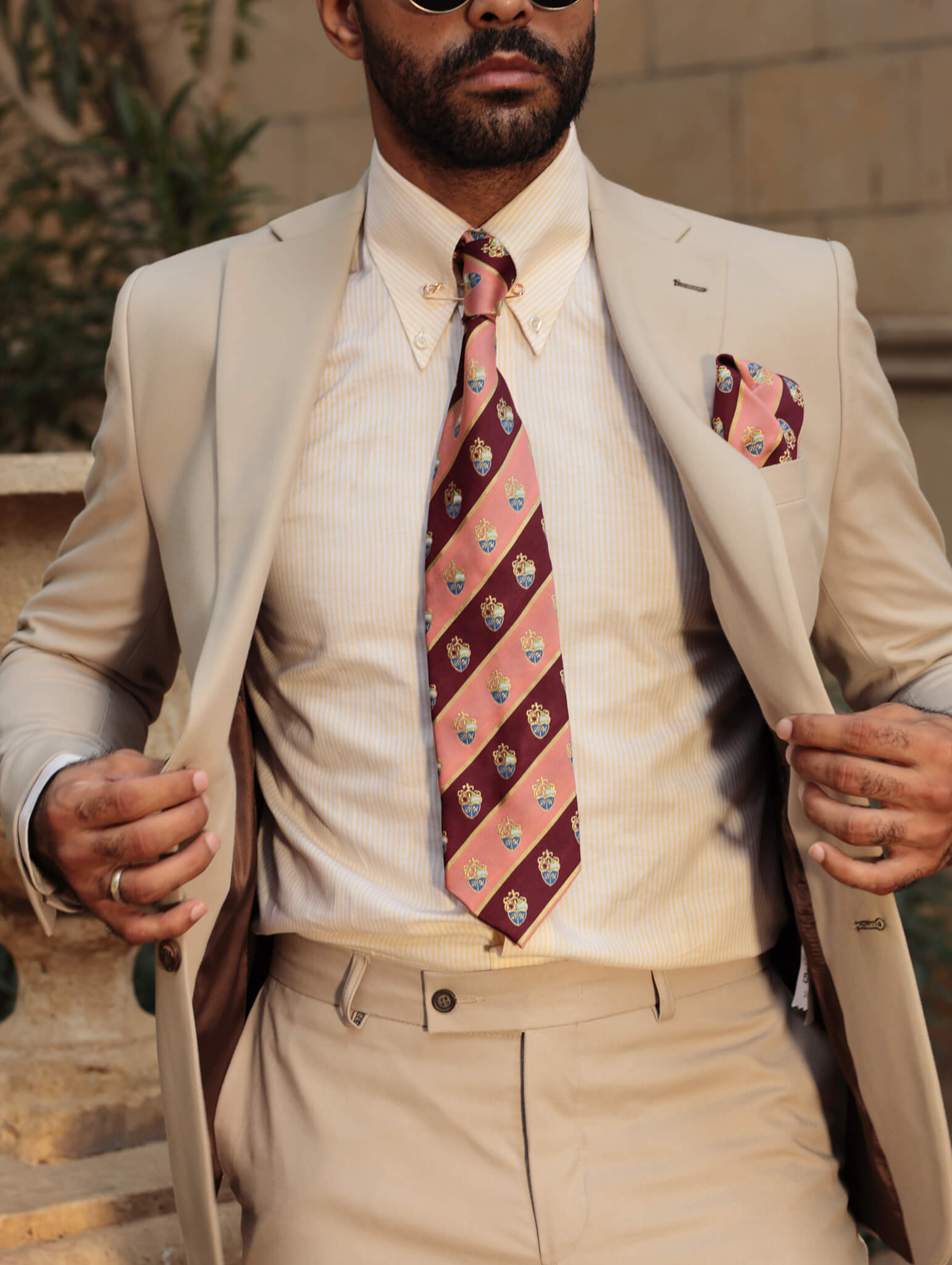 Elevate your formal attire with our BH Peach and Maroon Stripped Tie with matching pocket square, meticulously woven to perfection. Crafted with traditional techniques, this tie exemplifies timeless elegance and exceptional quality. The intricate Logo design, inspired by British regimental patterns, adds a sophisticated touch, making it a striking addition to any ensemble.