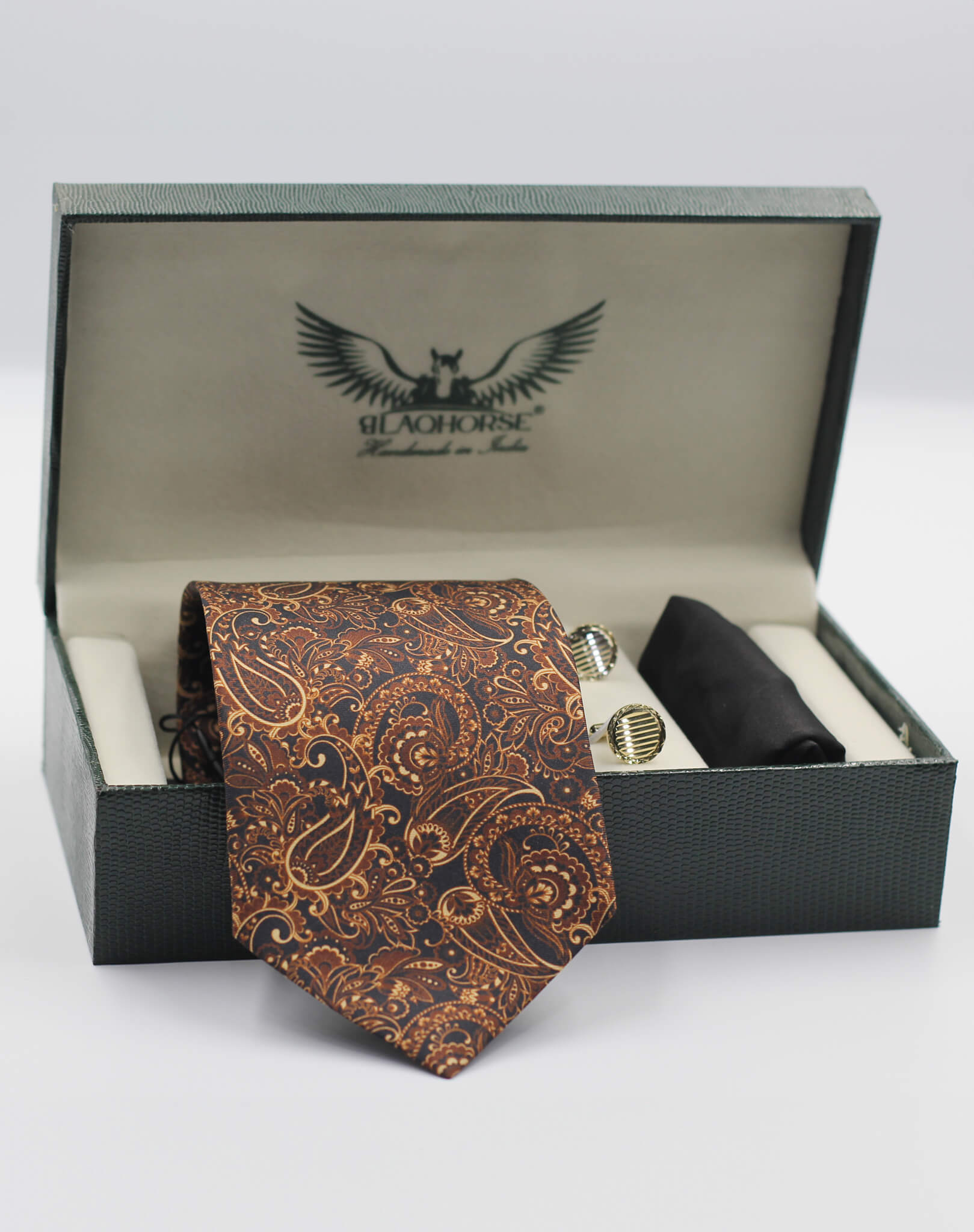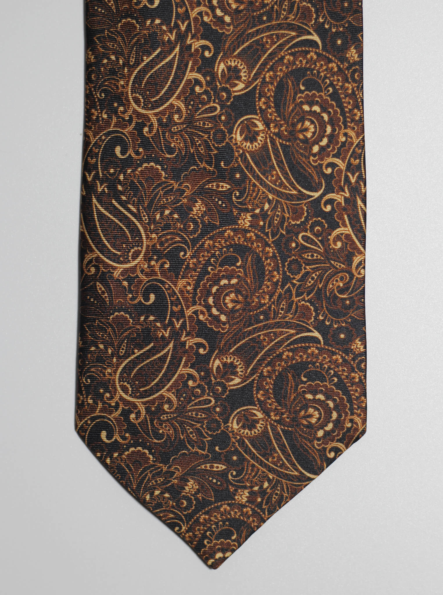 Elevate your accessory collection with our Brown and Black Paisley Madder Silk Tie with solid pocket square. Crafted from premium twill silk and treated with gum arabic for a uniquely soft, matte texture, this tie embodies both luxury and durability. The intricate geometric design paired with the rich navy hue adds a striking element to any outfit.