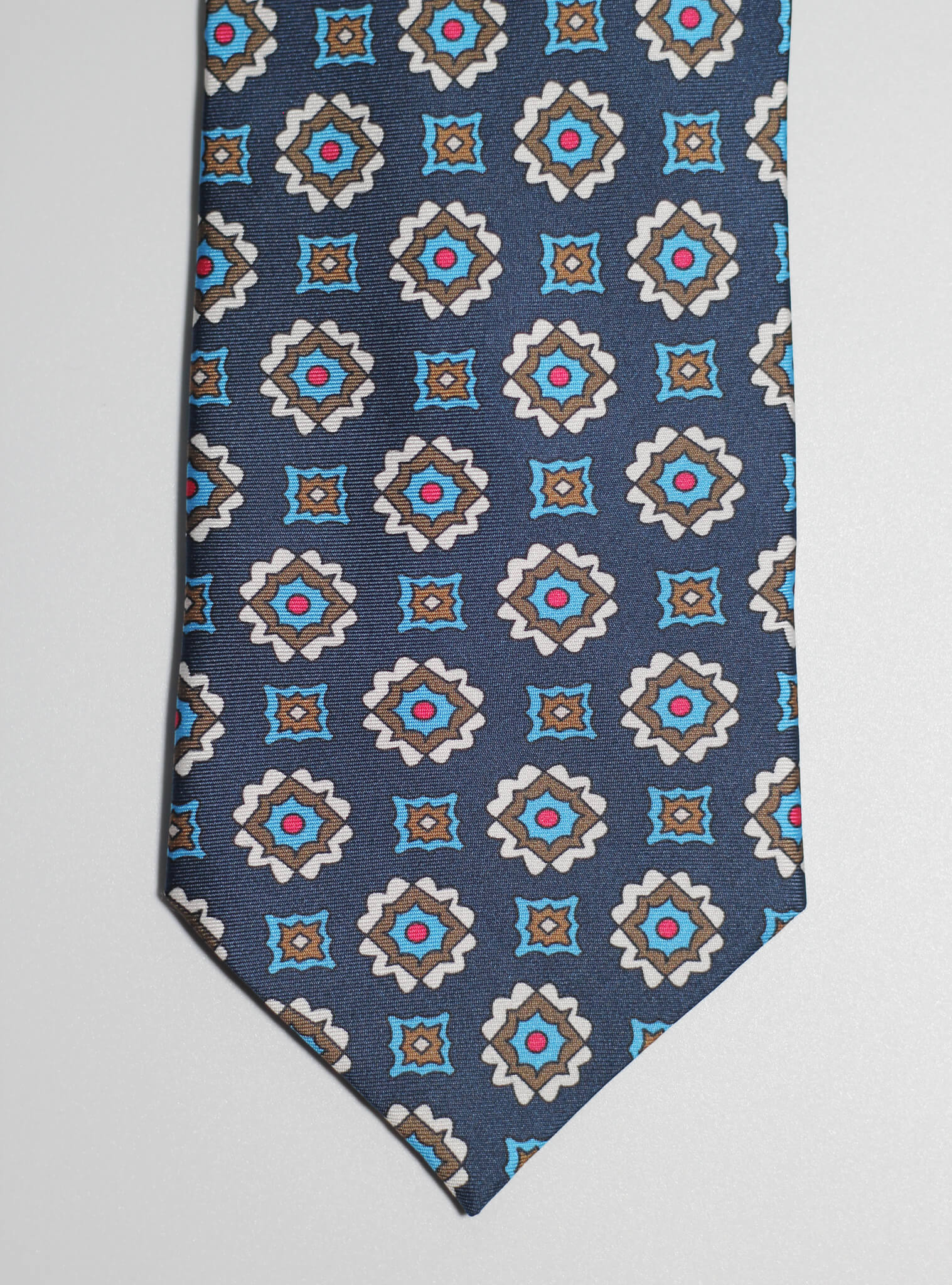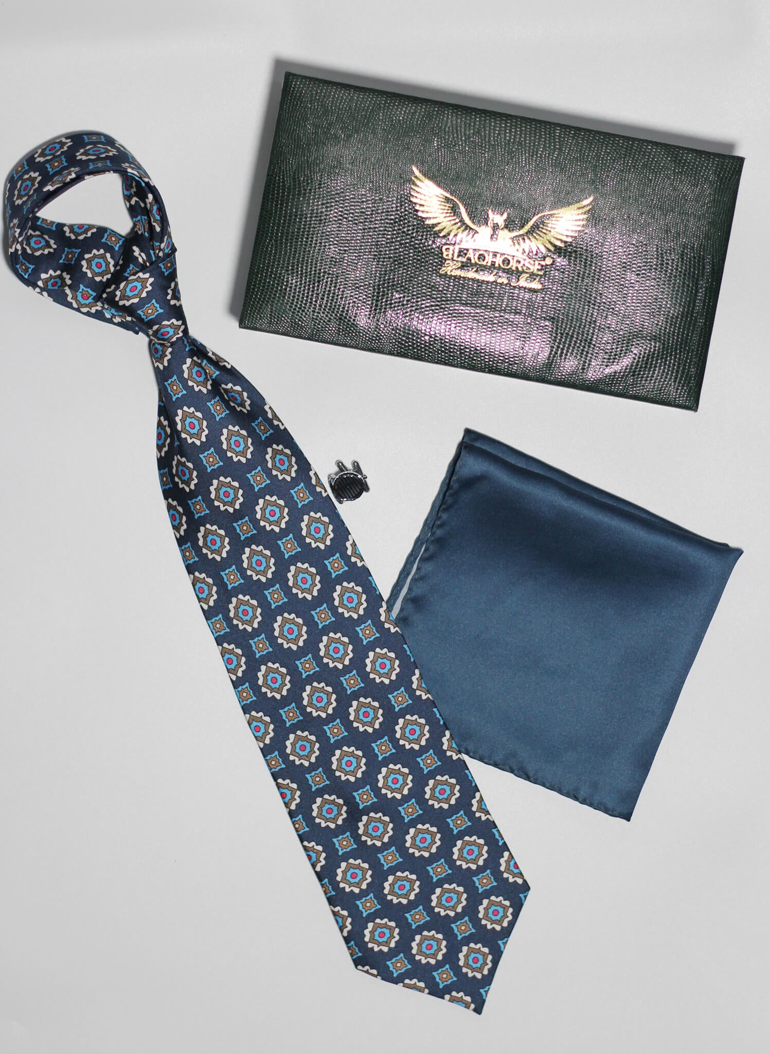 Elevate your accessory collection with our Dark Teal Geometric Madder Silk Tie with solid pocket square. Crafted from premium twill silk and treated with gum arabic for a uniquely soft, matte texture, this tie embodies both luxury and durability. The intricate geometric design paired with the rich navy hue adds a striking element to any outfit. Perfect for formal events or refined everyday wear, this tie offers a flexible structure that retains its shape beautifully. Experience the elegance of Italian craftsmanship and bring a touch of modern sophistication to your wardrobe with this timeless piece.