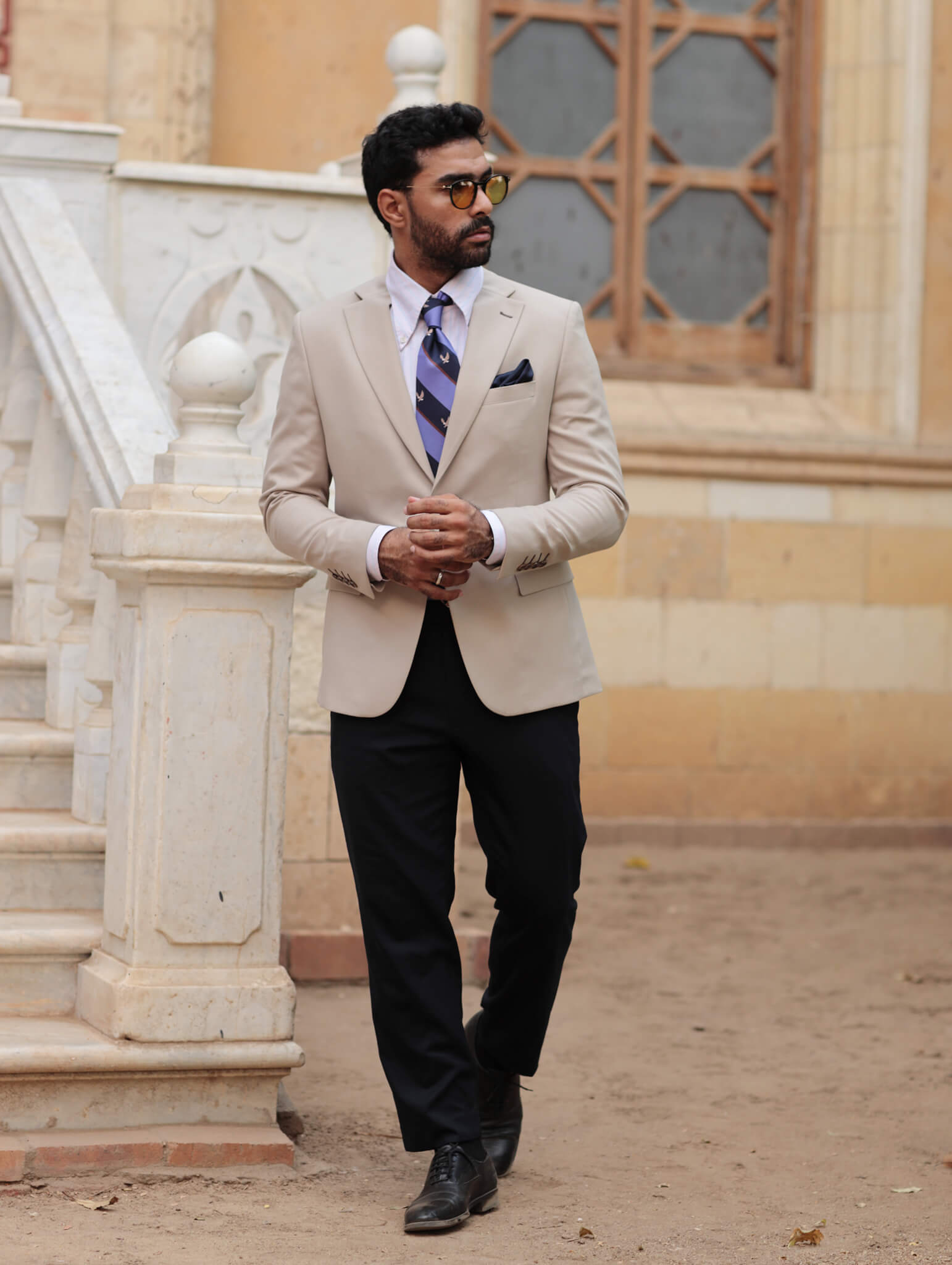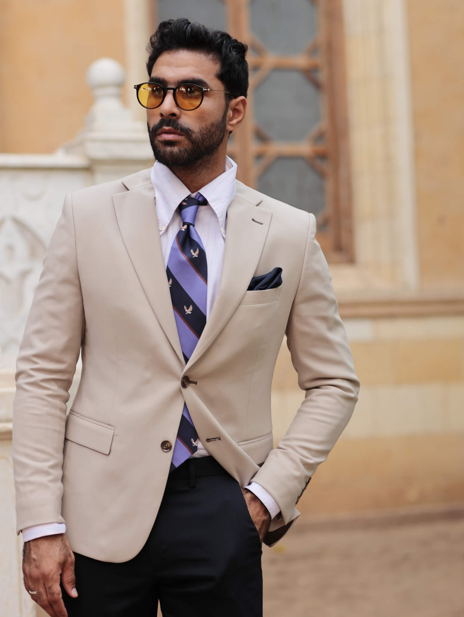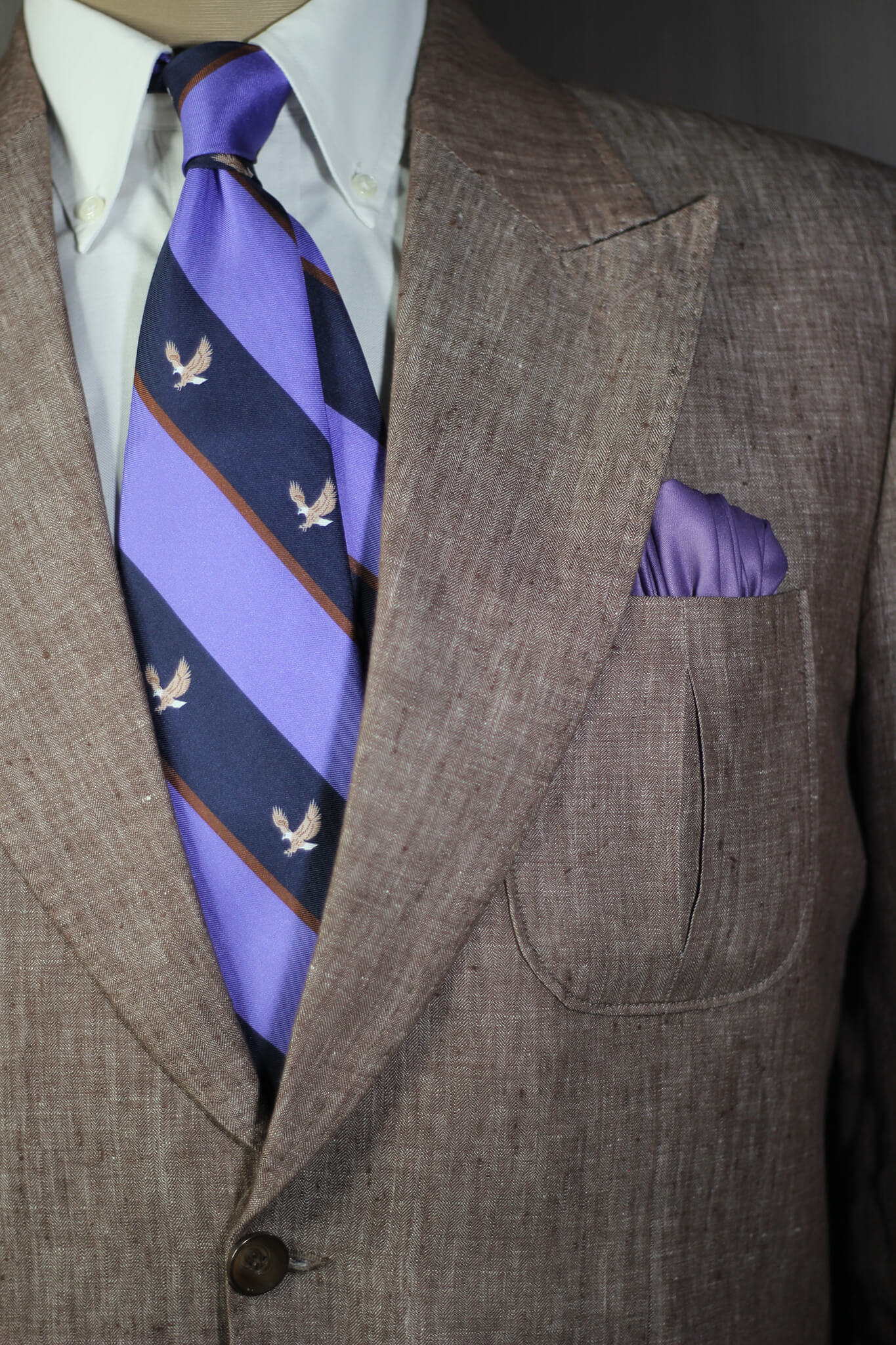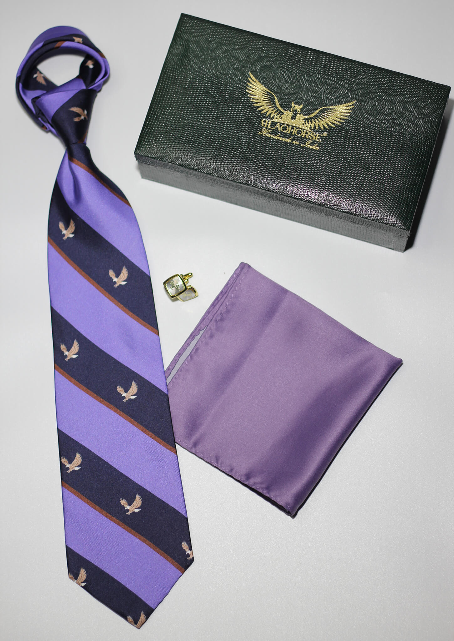 Elevate your accessory collection with our Flying Eagle and Black Madder Silk Tie with solid pocket square. Crafted from premium twill silk and treated with gum arabic for a uniquely soft, matte texture, this tie embodies both luxury and durability. The intricate geometric design paired with the rich navy hue adds a striking element to any outfit.