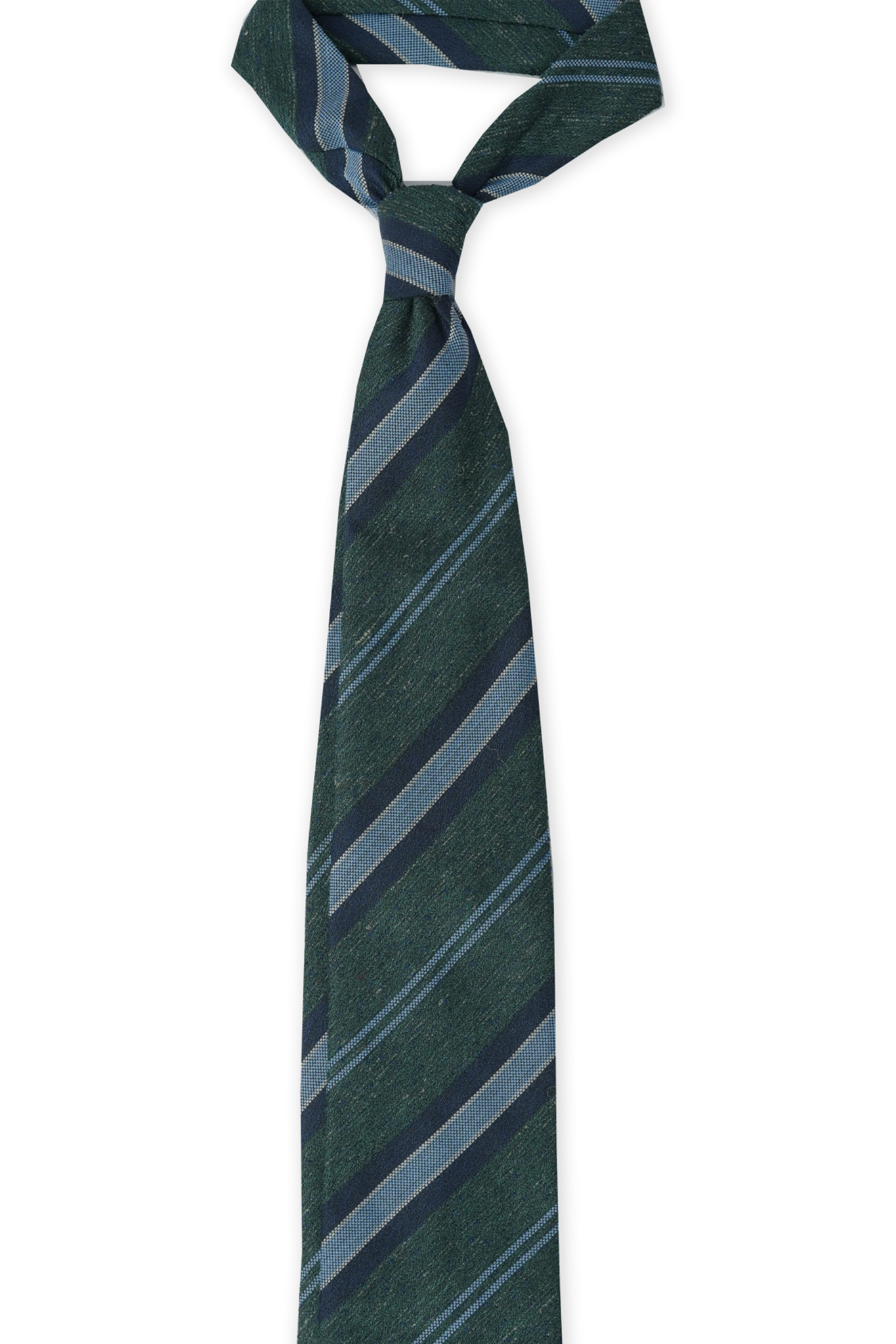 Elevate your accessory collection with our Green And Grey Striped Cashmere Tie with matching pocket square, designed for lightness and comfort. This tipped tie features a bottlecut shape in a threefold construction, allowing for an elegant knot that complements any ensemble.