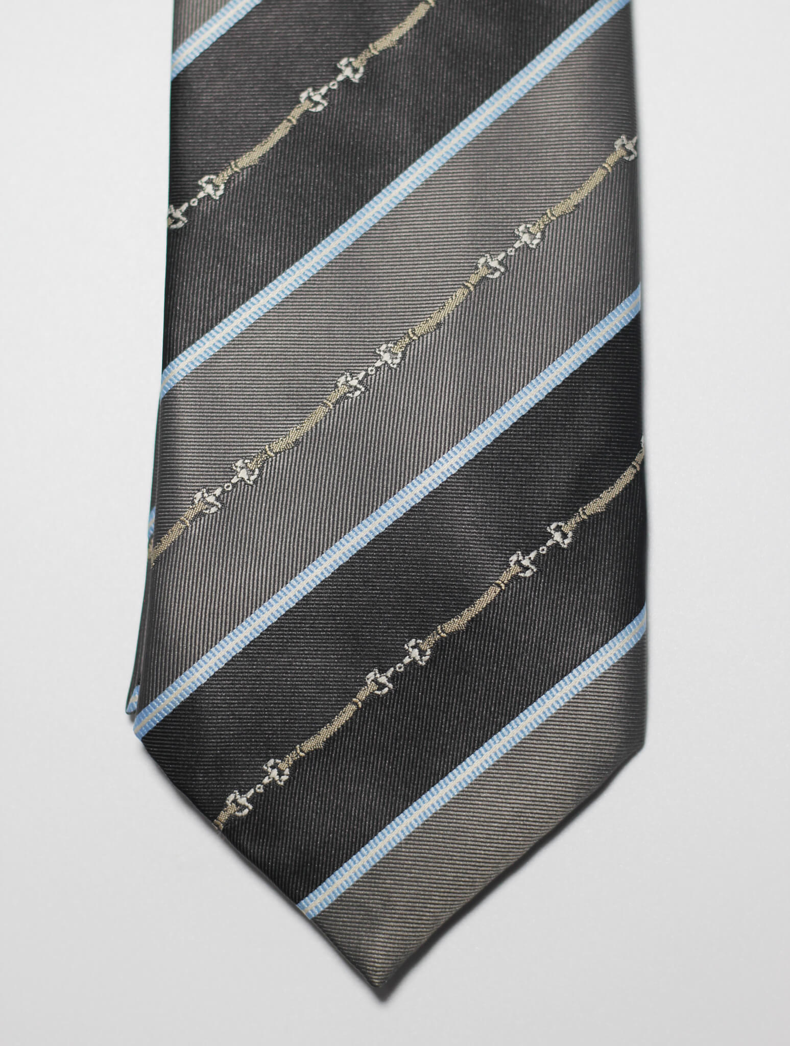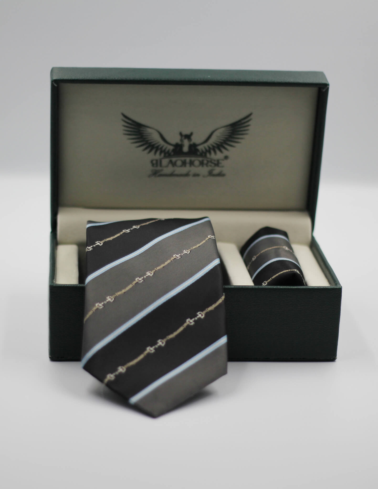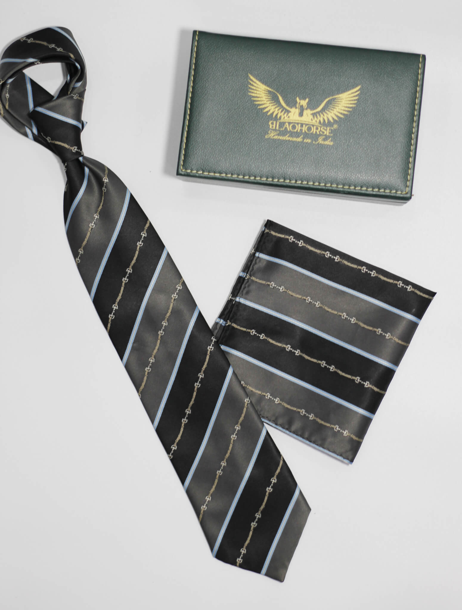 Elevate your formal attire with our Horsbit Striped Tie with matching pocket square, meticulously woven to perfection. Crafted with traditional techniques, this tie exemplifies timeless elegance and exceptional quality. The intricate horsebit design, inspired by British regimental patterns, adds a sophisticated touch, making it a striking addition to any ensemble.