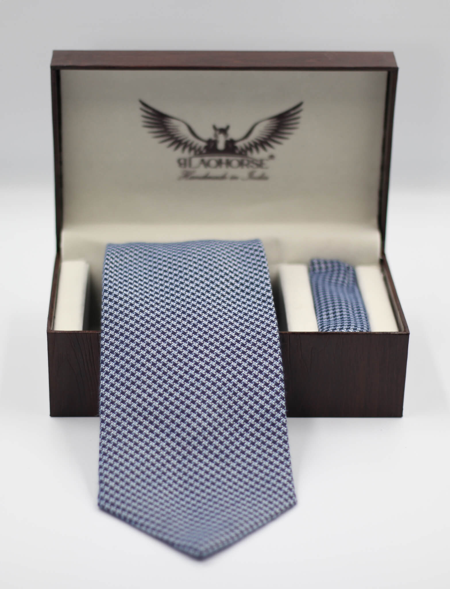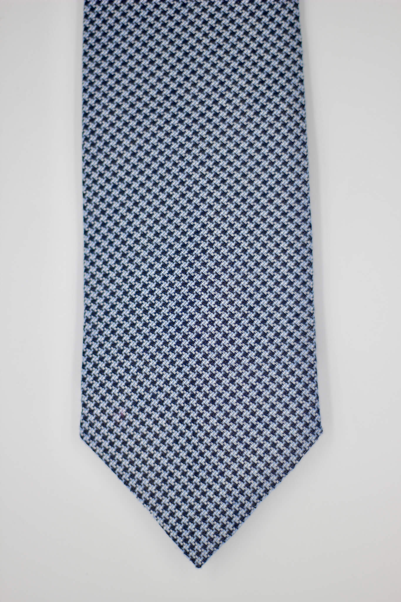 Elevate your accessory collection with our blue houndstooth cashmere tie with matching pocket square, designed for lightness and comfort. This tipped tie features a bottlecut shape in a threefold construction, allowing for an elegant knot that complements any ensemble.