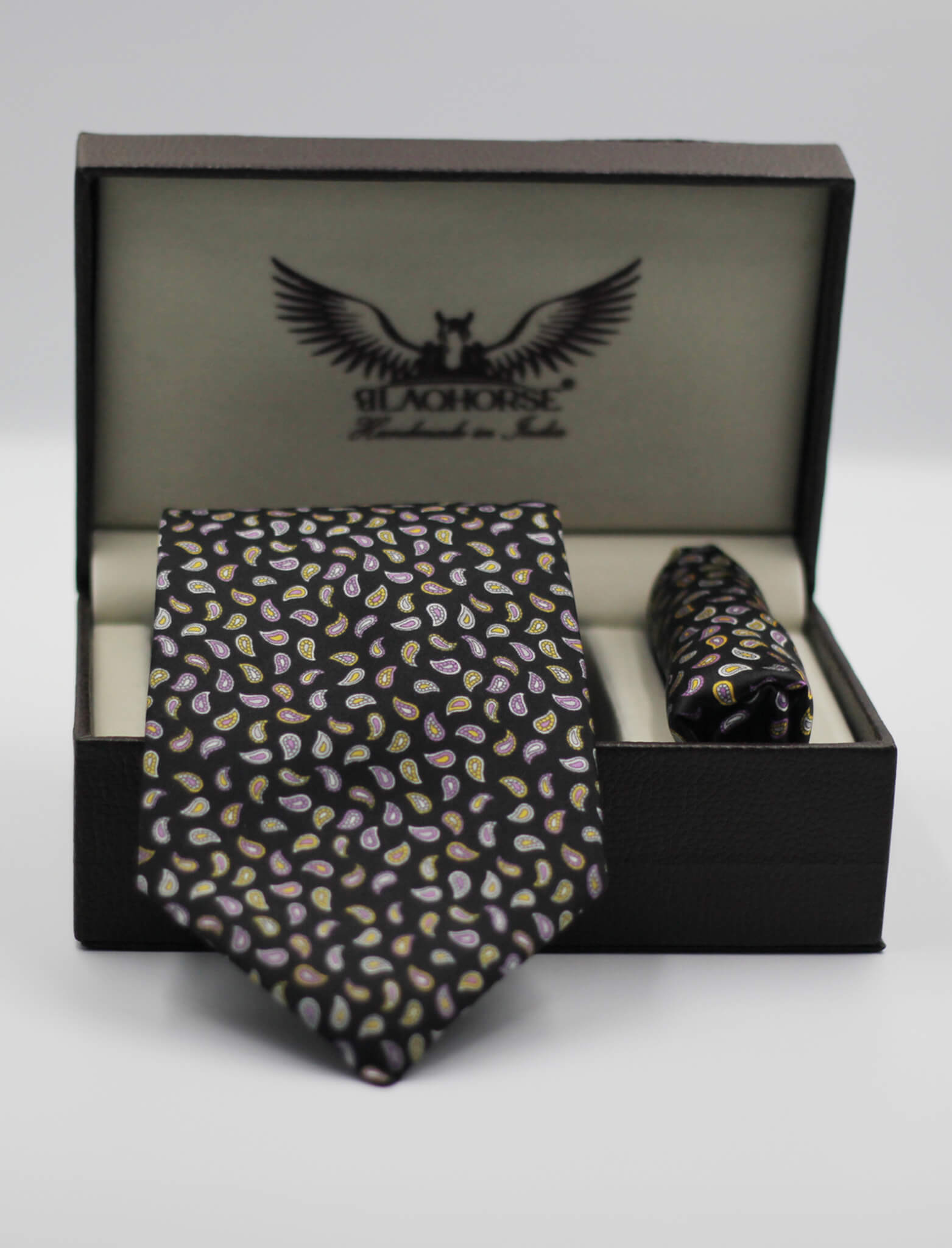 Elevate your formal attire with our Mini Paisley Black and Lavender satin silk tie and matching pocket square. Crafted in India from premium satin silk, this tie features traditional hand-sewing techniques for exceptional quality.