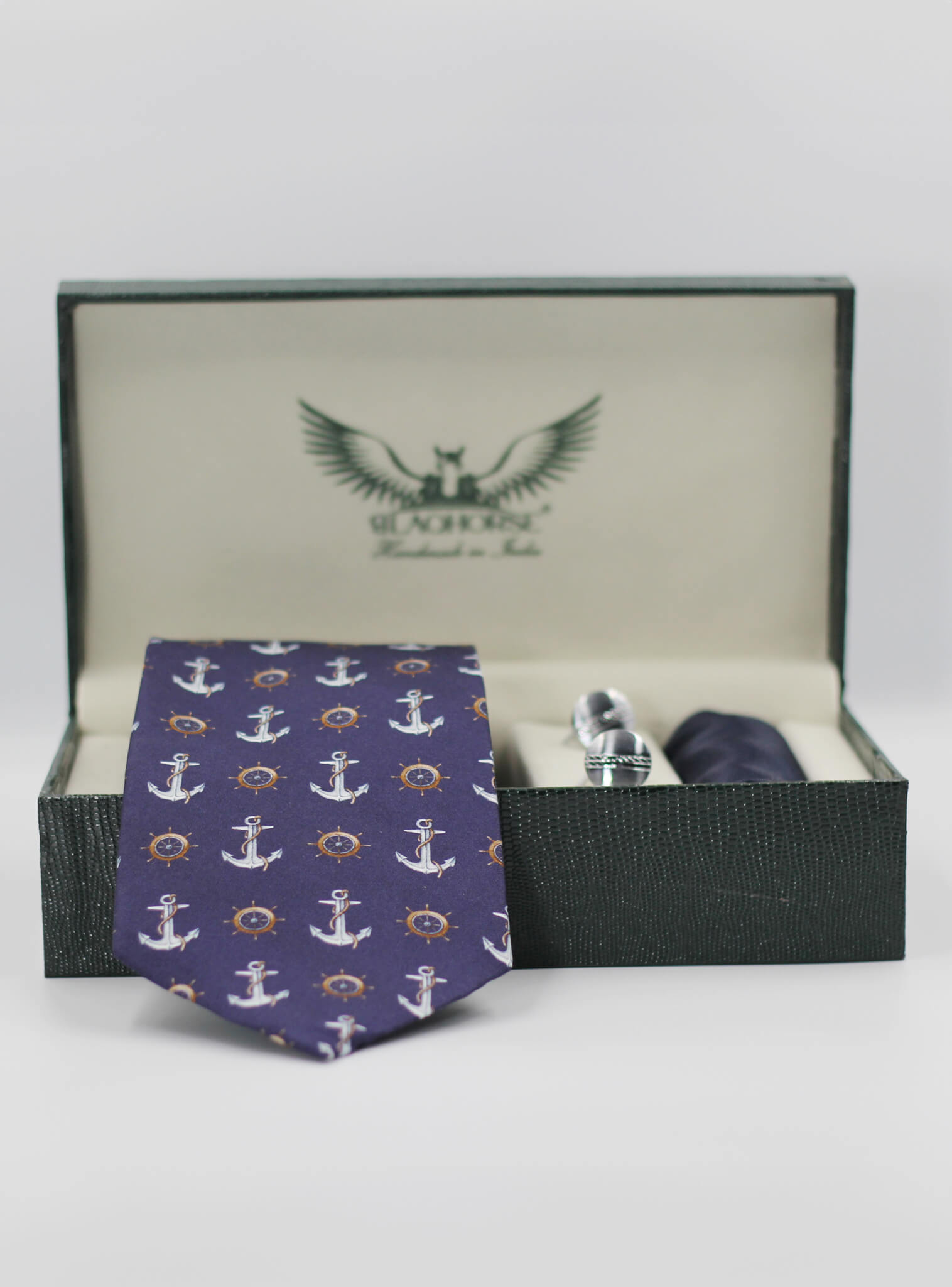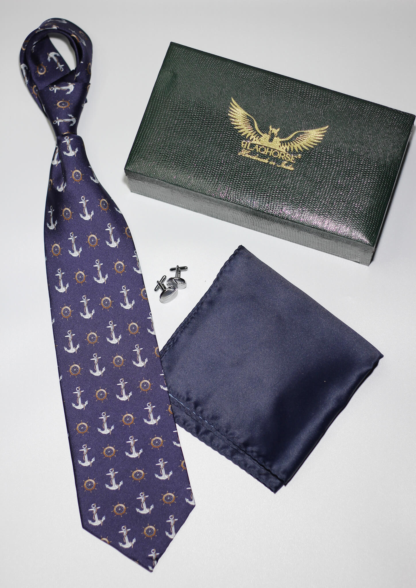 Elevate your accessory collection with our Navy Anchor Madder Silk Tie with solid pocket square. Crafted from premium twill silk and treated with gum arabic for a uniquely soft, matte texture, this tie embodies both luxury and durability. The intricate geometric design paired with the rich navy hue adds a striking element to any outfit.