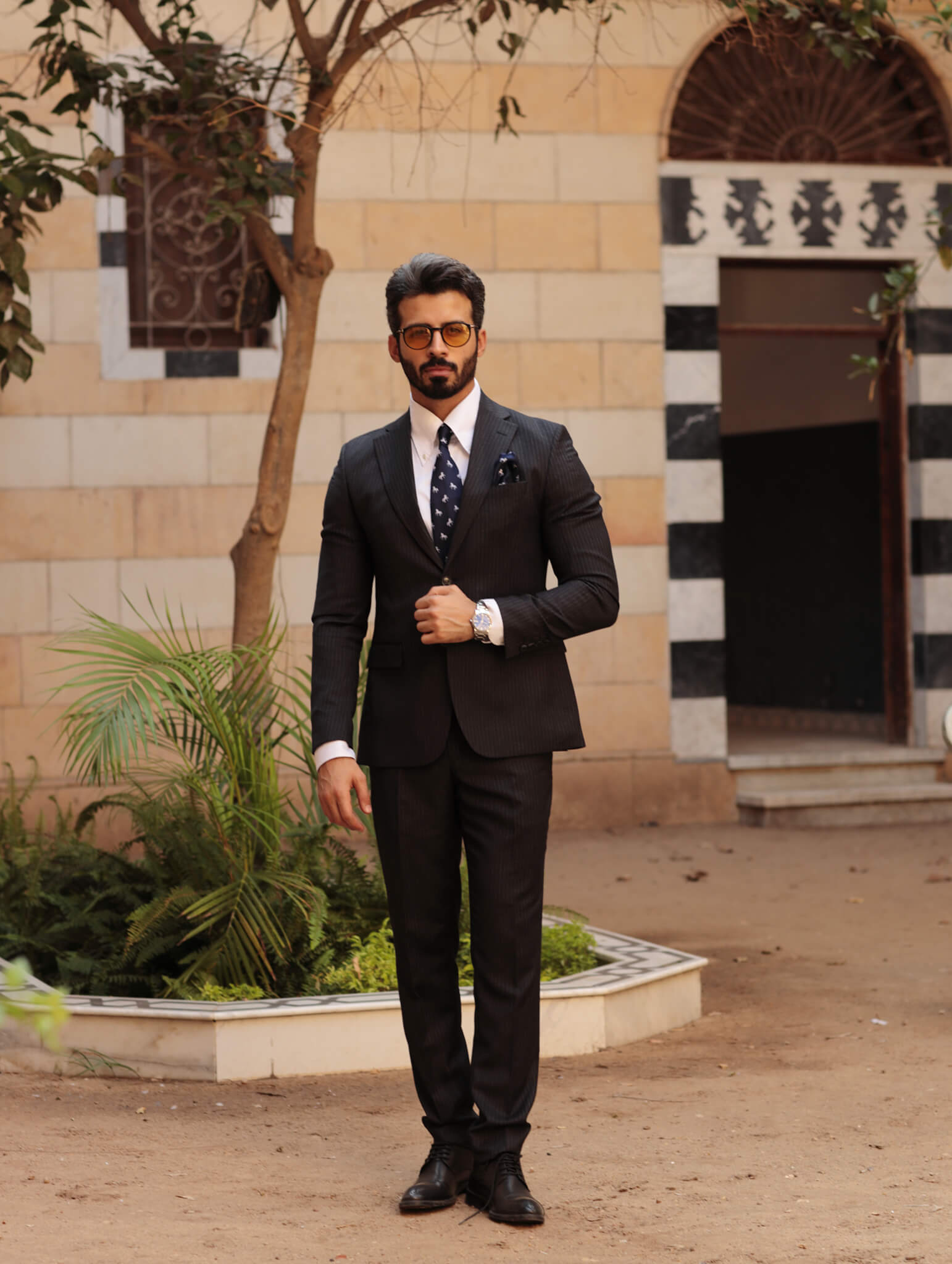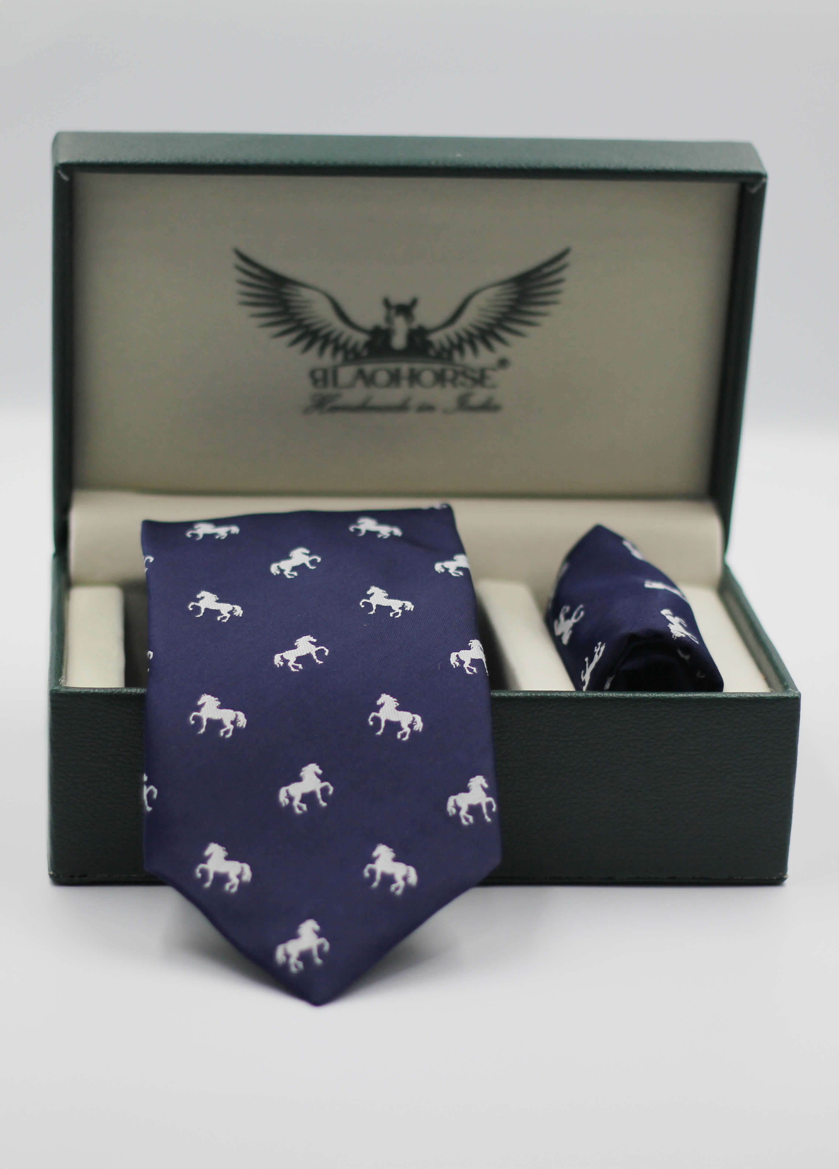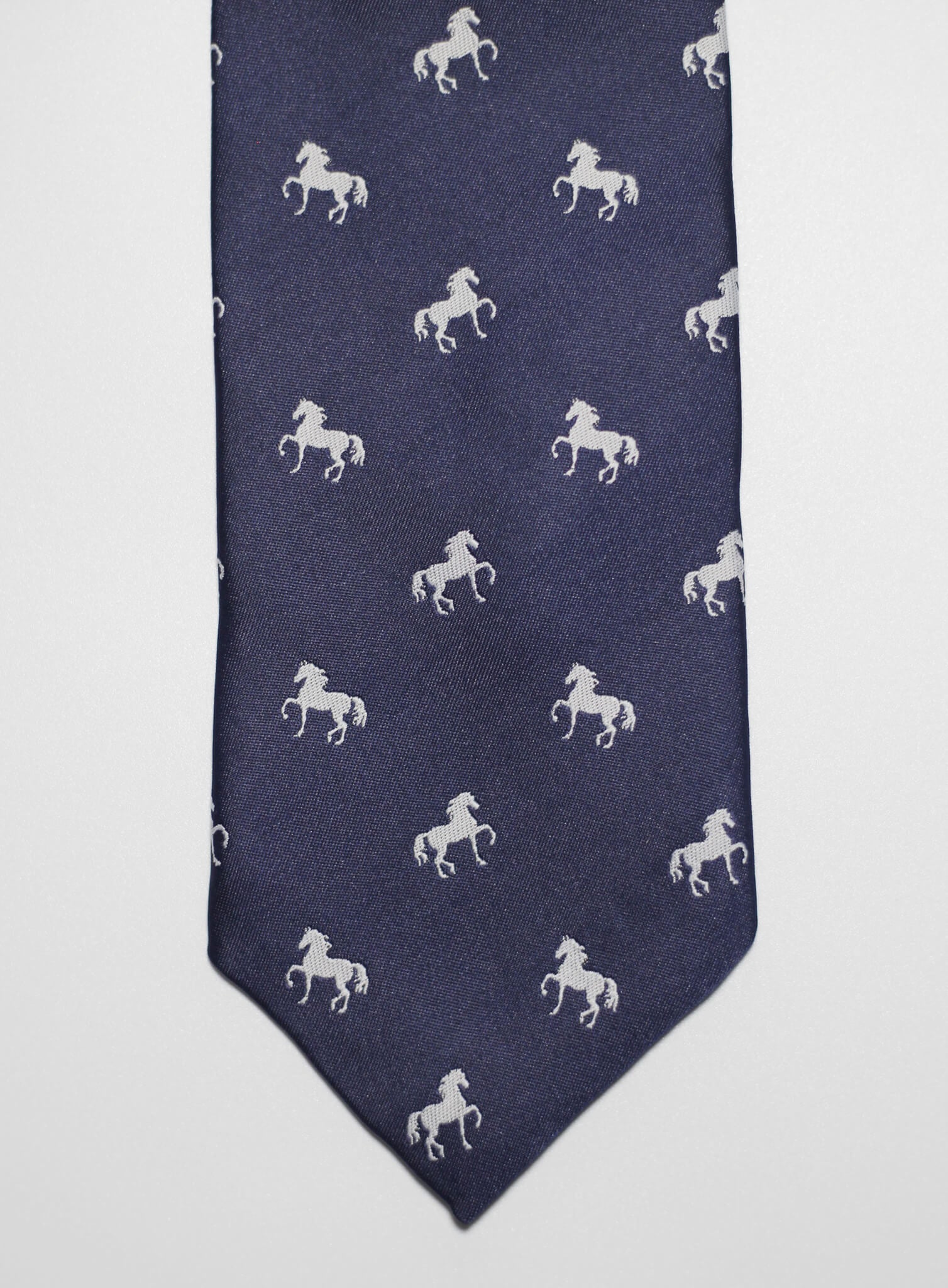 Elevate your formal attire with our Navy Blue Dancing Horse Tie with matching pocket square, meticulously woven to perfection. Crafted with traditional techniques, this tie exemplifies timeless elegance and exceptional quality. The intricate design, inspired by British regimental patterns, adds a sophisticated touch, making it a striking addition to any ensemble.