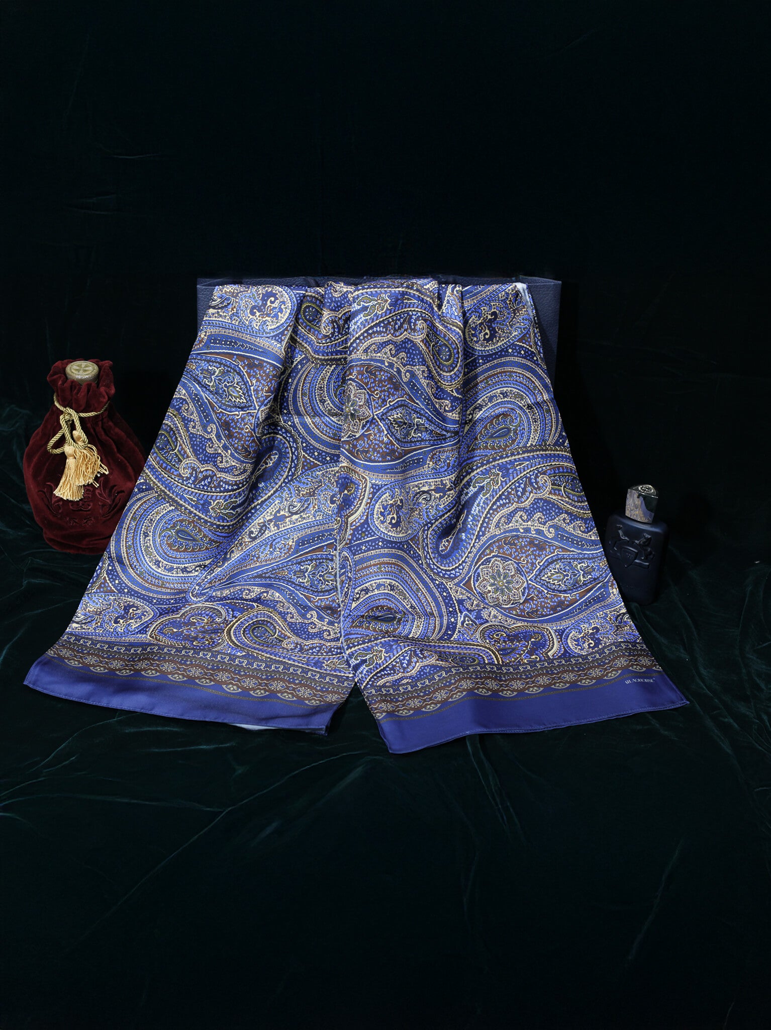 Elevate your style with our Navy Blue Paisley Long Scarf, crafted from luxurious satin twill. Featuring an elegant paisley design in rich navy tones, this scarf adds a classic touch to any outfit. It comes with a matching pocket square, making it the perfect accessory set for both casual outings and formal events. Transform your look effortlessly with this timeless piece!