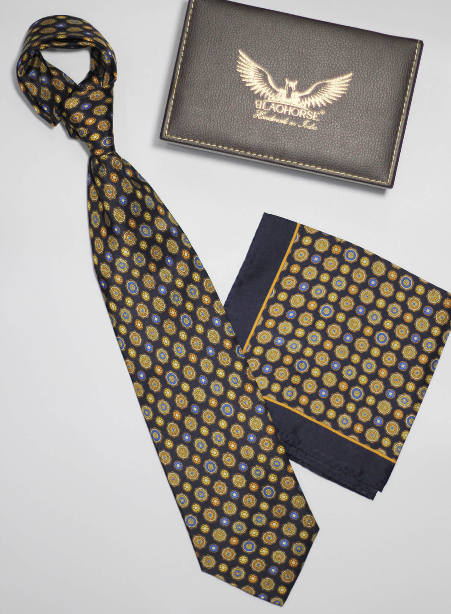 Elevate your formal attire with our Navy Medallion satin silk tie and matching pocket square. Crafted in India from premium satin silk, this tie features traditional hand-sewing techniques for exceptional quality.