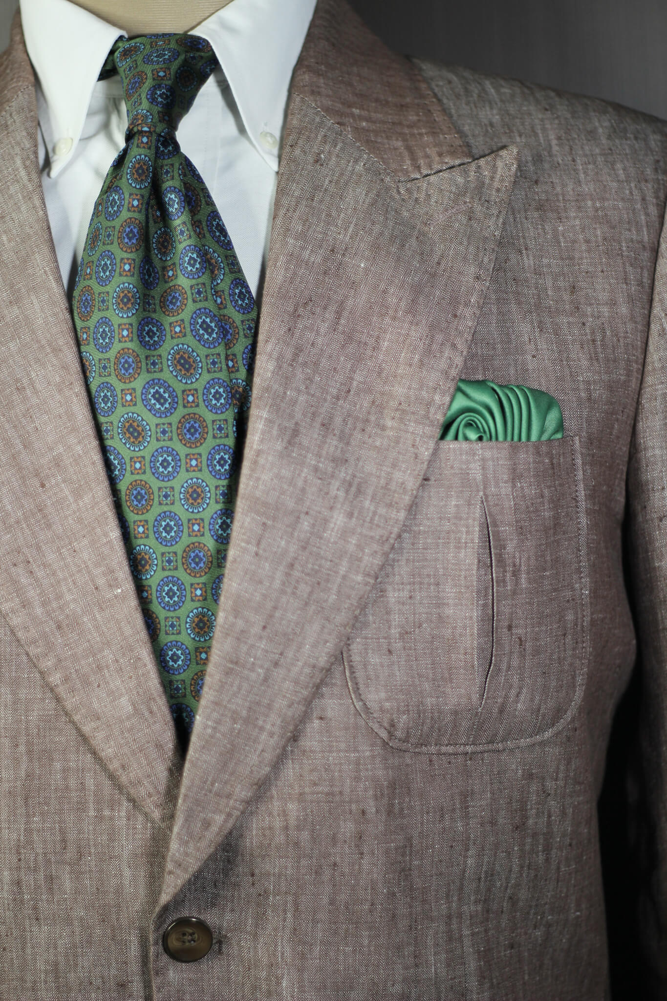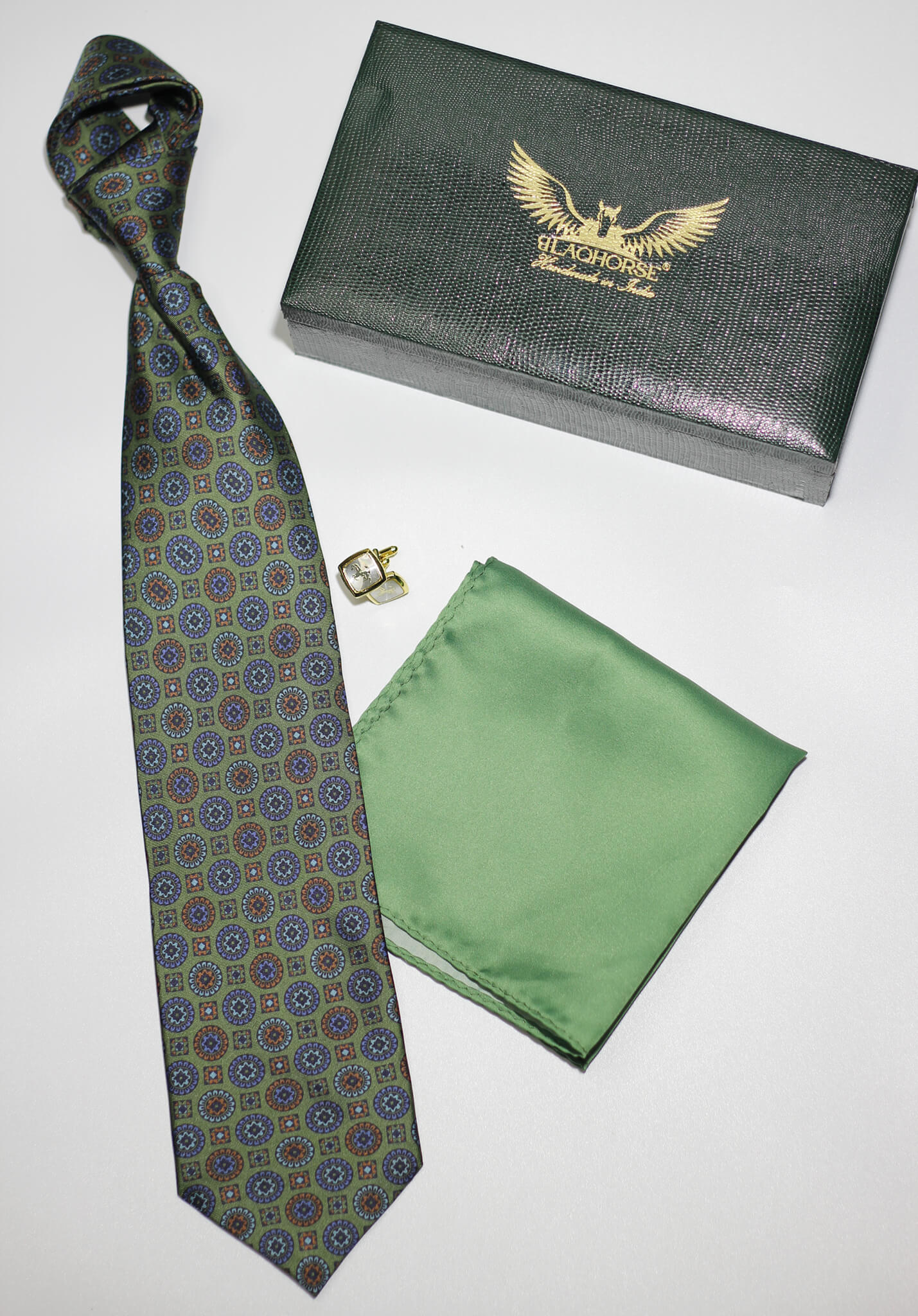 Elevate your accessory collection with our Olive Green Medallion Madder Silk Tie with solid pocket square. Crafted from premium twill silk and treated with gum arabic for a uniquely soft, matte texture, this tie embodies both luxury and durability. The intricate geometric design paired with the rich navy hue adds a striking element to any outfit.