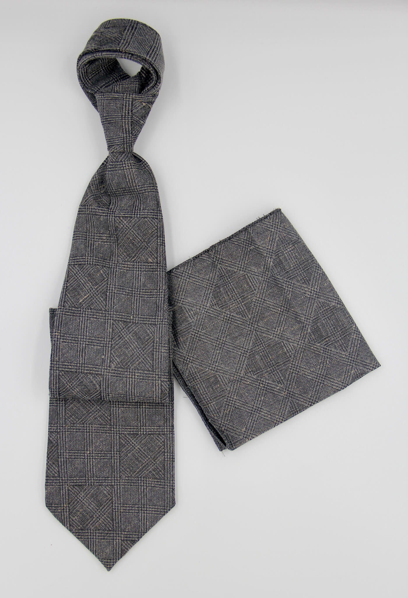 Elevate your style with our grey Prince of Wales cashmere tie with matching pocket square, designed for lightness and comfort. This tipped tie features a bottlecut shape in a threefold construction, allowing for an elegant knot that enhances any outfit.