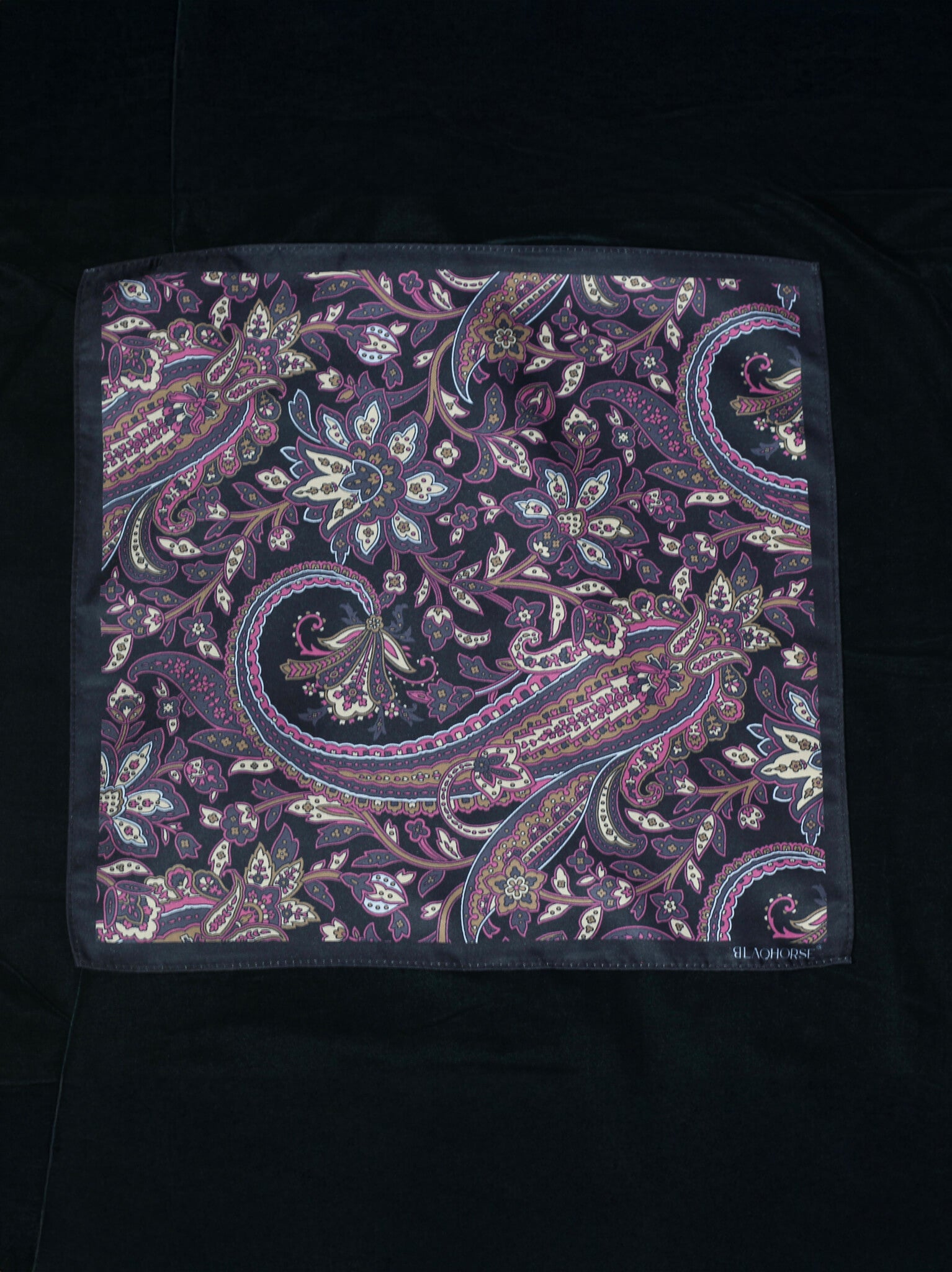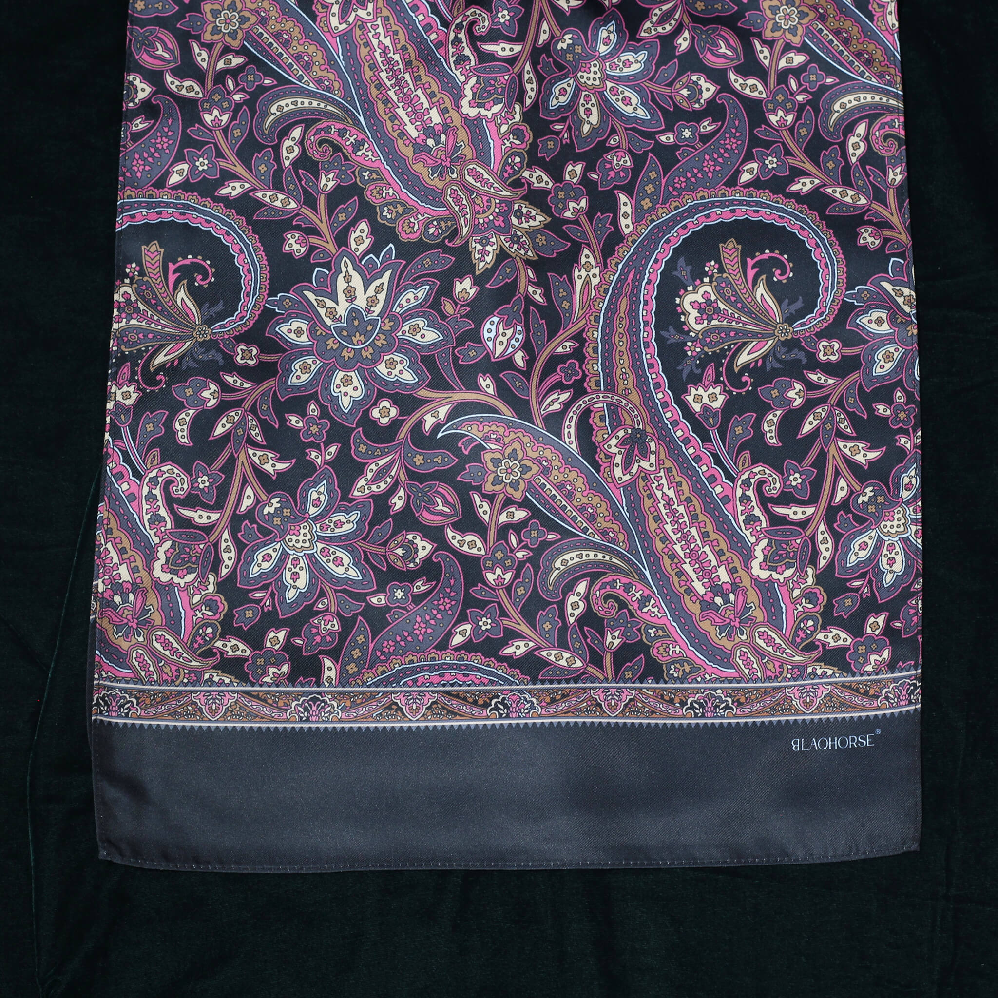 Elevate your style with our Purple on Black Paisley Long Scarf, crafted from luxurious satin twill. Featuring a stunning paisley design in vibrant purple against a sleek black background, this scarf adds a bold and elegant touch to any outfit. It comes with a matching pocket square, making it the perfect accessory set for both casual and formal occasions. Transform your look effortlessly with this striking piece!