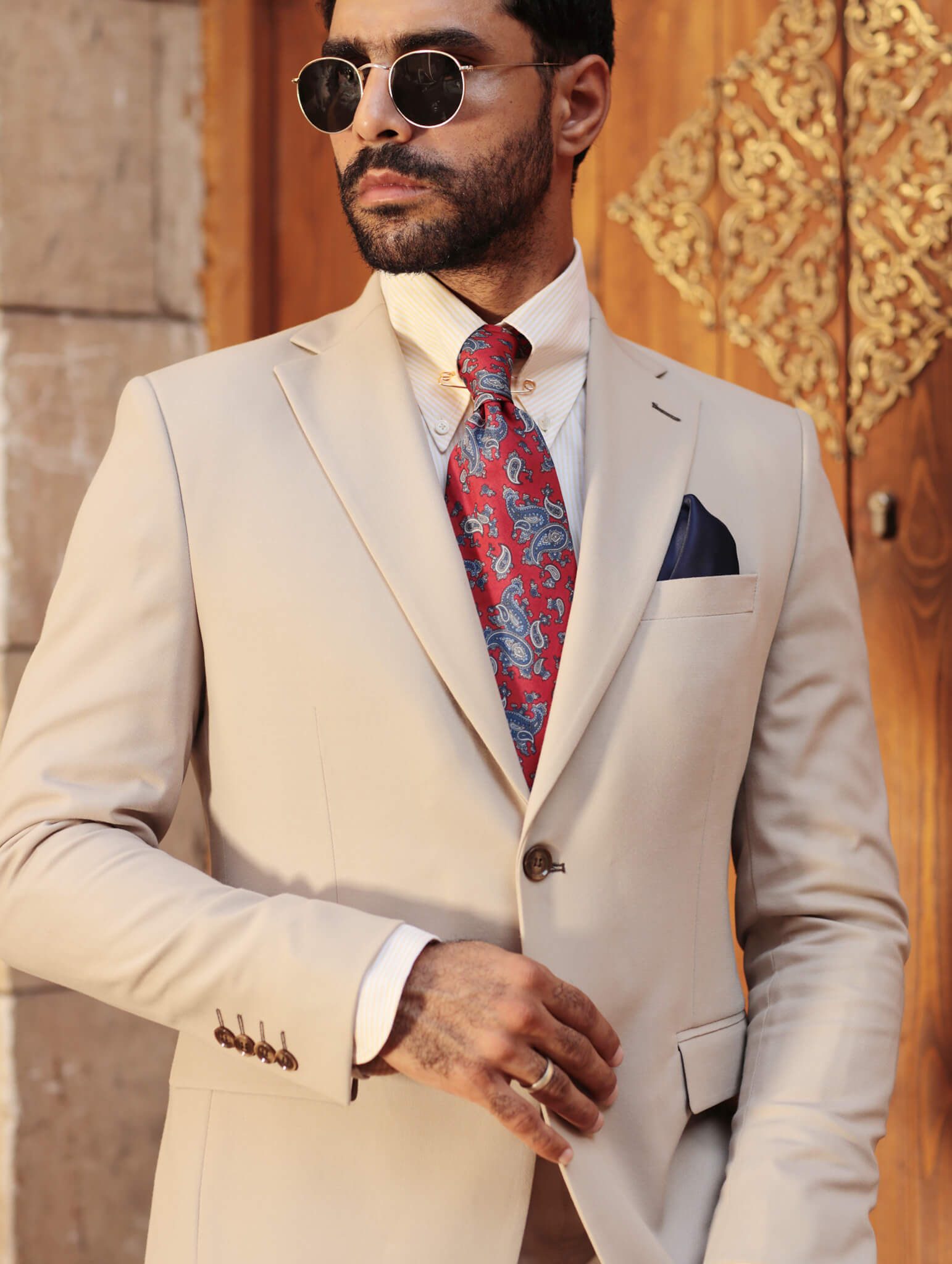 The intricate paisley design, makes it perfect for daytime ceremonies while offering timeless elegance. With a bottle cut shape and threefold tipped construction, this tie ensures a refined look and a beautifully shaped knot.Make a sophisticated statement on your special day with the luxury of Indian craftsmanship.