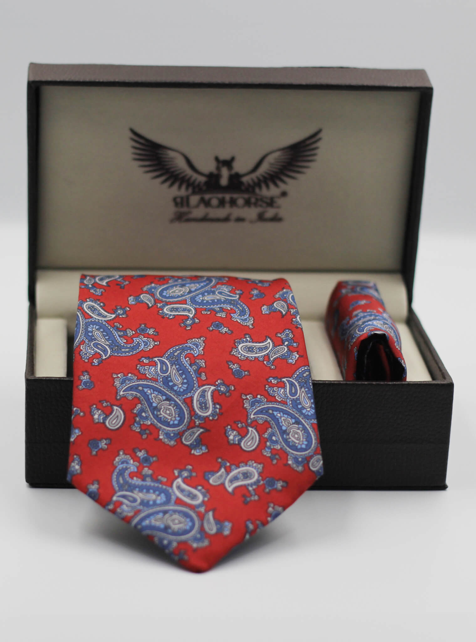 Elevate your formal attire with our Red and Blue paisley satin silk tie and matching pocket square. Crafted in India from premium satin silk, this tie features traditional hand-sewing techniques for exceptional quality.