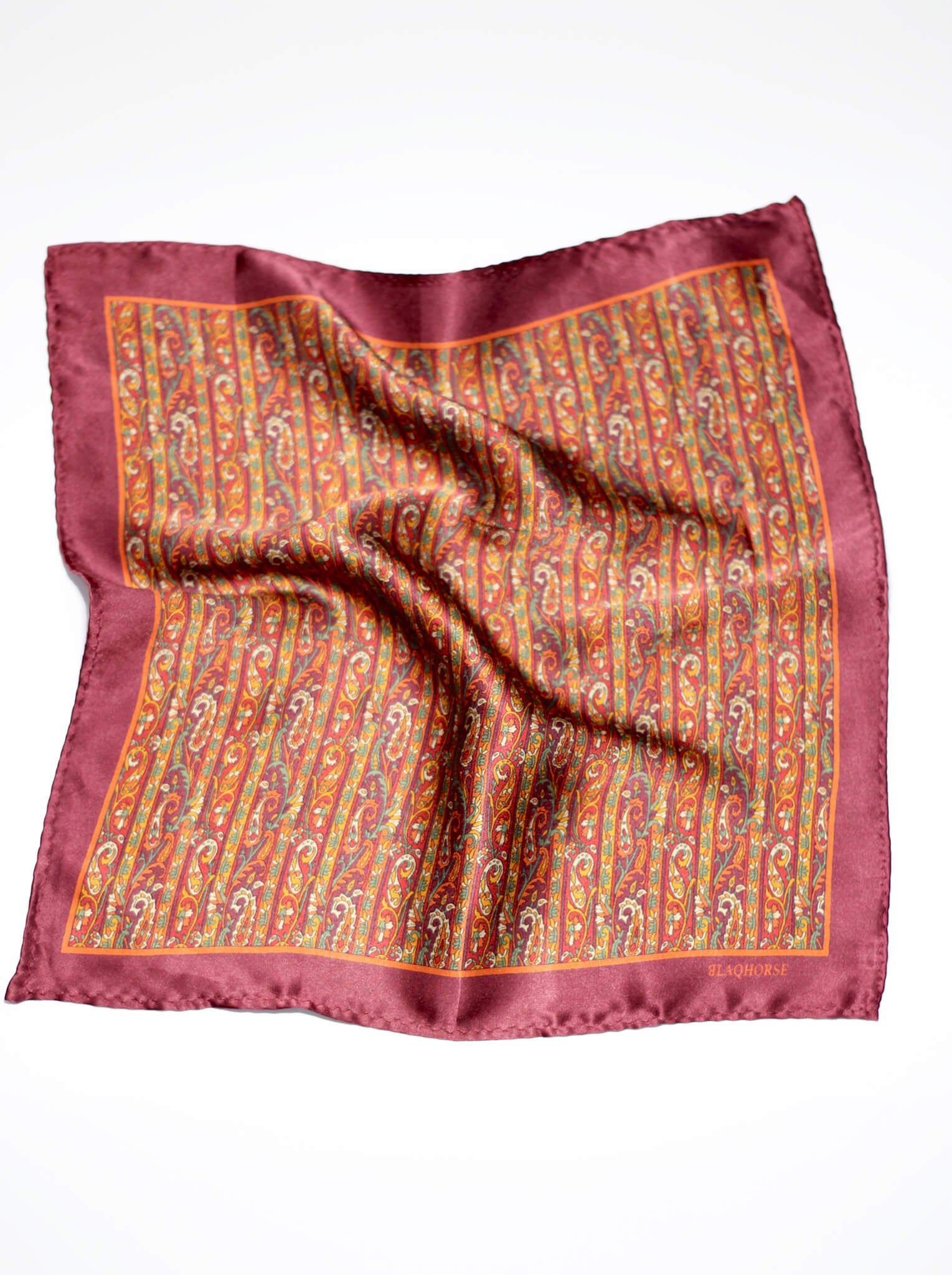 Enhance your style with our Red Linear Paisley Pocket Square, crafted from the finest Italian silk. This striking accessory features a bold paisley design that beautifully combines warm rust and deep black tones, making it a perfect statement piece for any occasion. Ideal for elevating a blazer or adding flair to your outfit, this pocket square effortlessly blends sophistication and charm. Treat yourself or give it as a thoughtful gift—it's sure to impress!