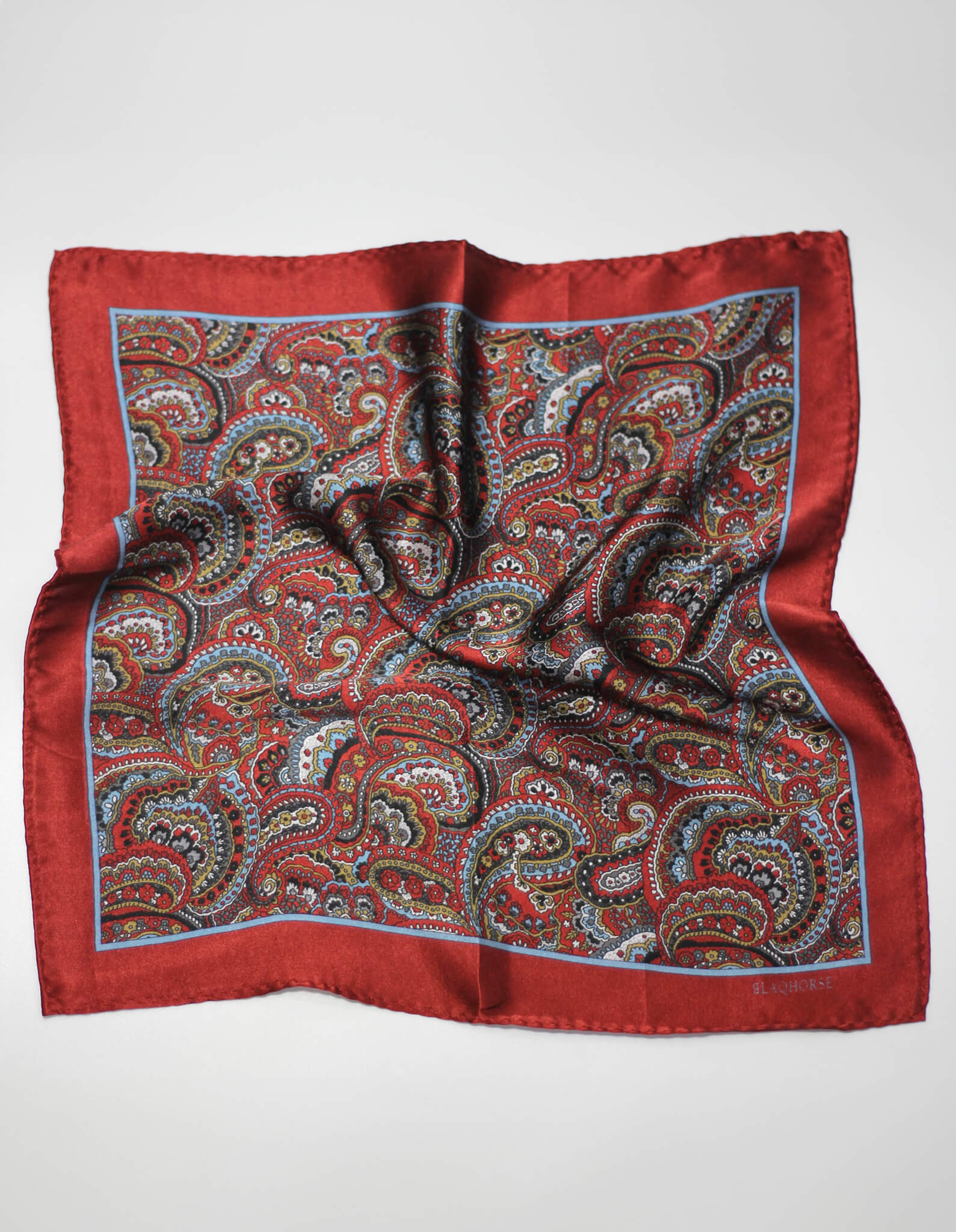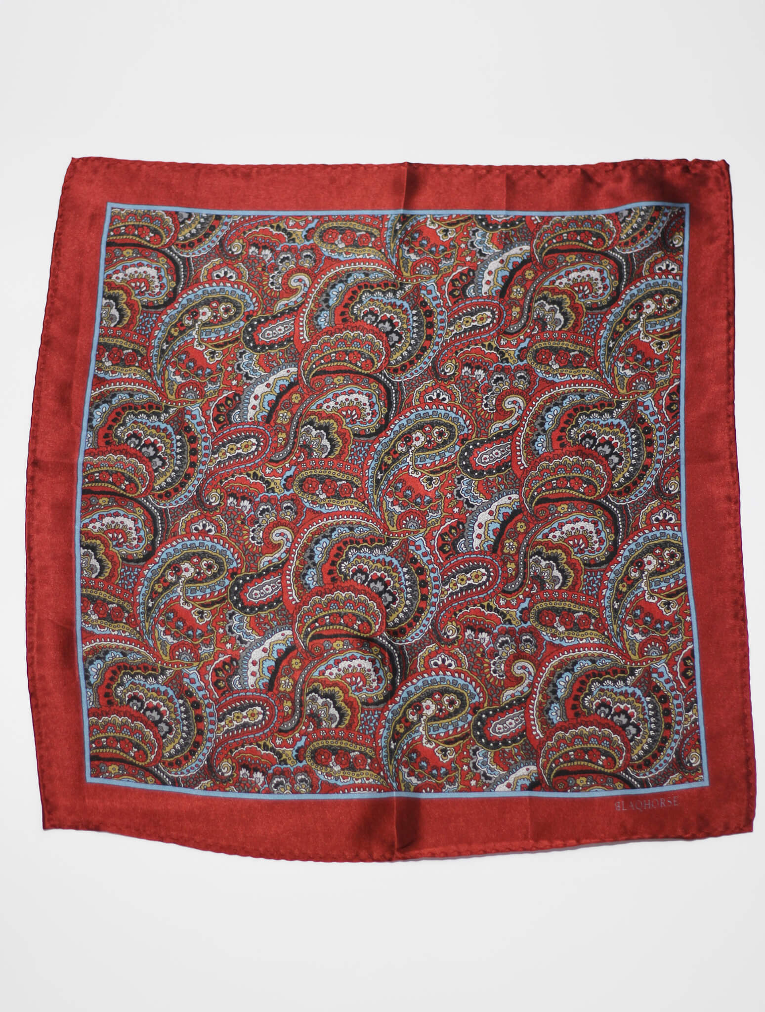Enhance your style with our Red Paisley Pocket Square, crafted from the finest Italian silk. This striking accessory features a bold paisley design that beautifully combines warm rust and deep black tones, making it a perfect statement piece for any occasion. Ideal for elevating a blazer or adding flair to your outfit, this pocket square effortlessly blends sophistication and charm. Treat yourself or give it as a thoughtful gift—it's sure to impress!